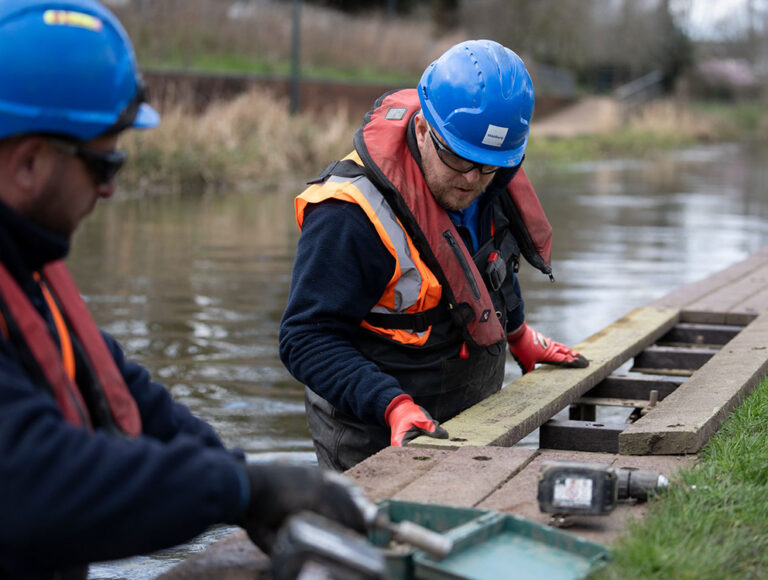 Due to elevated water levels at the beginning of the programme, the team began working on the horizontal boards above the water level, replacing spacers on the top side and prioritising areas that presented the greatest risk to the public. Once the water level had dropped enough to expose the sides, the team continued to replace the horizontal and vertical spacers in sections. In total, 700m was replaced over the four-week period.