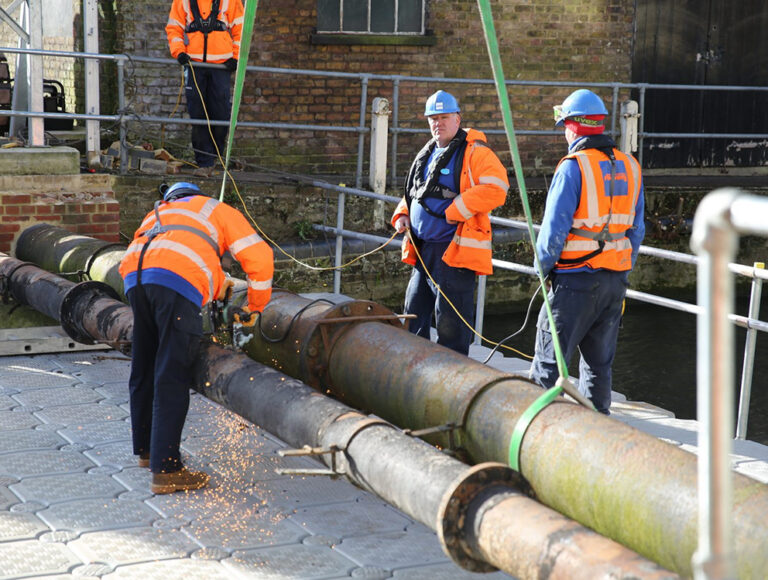 Works began with the removal of the pipework across the river using a floating pontoon system to enable safe access onto the water; a mobile crawler crane was then used to lift the old pipework from the river to install the new pipework into place.