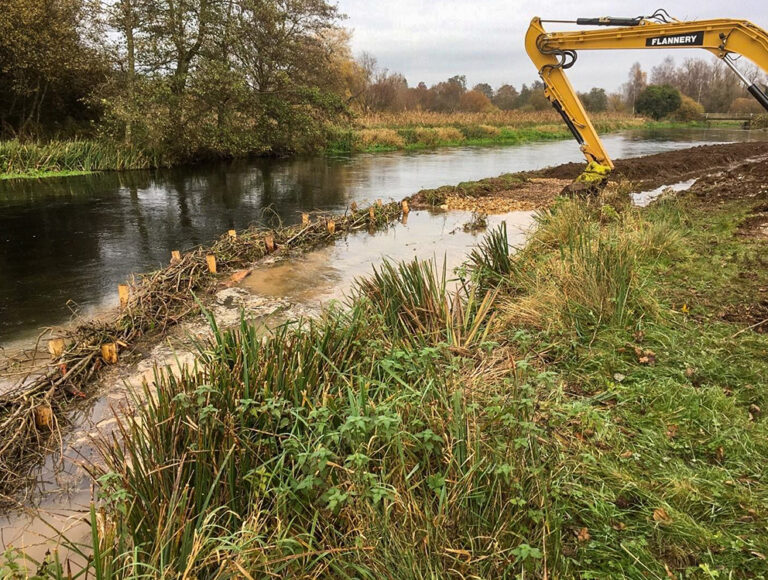 Channel planform improvements were completed by creating three angler-accessible marginal berms. The toe outlines were constructed with brash supported by stakes made from the locally won wood and reinforced using a combination of imported washed stone, which consisted of 40mm-75mm washed flint rejects, and the locally sourced grit and topsoil.