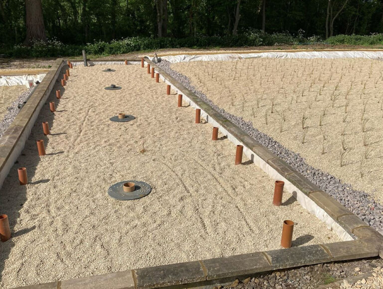 Pipework between the beds was taken up, retaining for reuse. The stone was then excavated and removed. The existing liner and geotextile were taken out, and the clay base recompacted to receive the new base geotextile layer and then the EPDM (synthetic rubber) liner. Inlet and outlet pipe penetrations were welded and sealed.