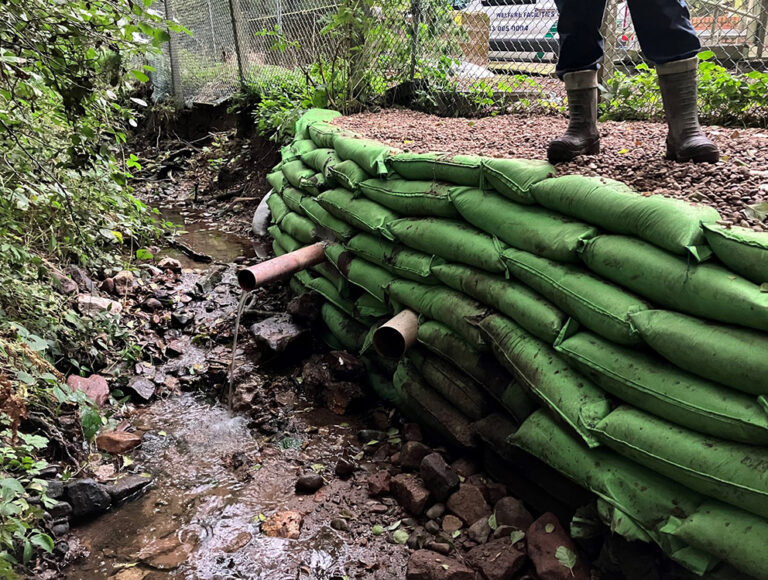 At the eroded access track a timber revetment was constructed from 4-inch wooden posts and sleepers. Locally-sourced clean stone was used as backfill and compacted after every two courses of the bags were installed. A hardstanding access path and sampling area was then constructed using clean 40mm gravel and surrounded by timber handrails.