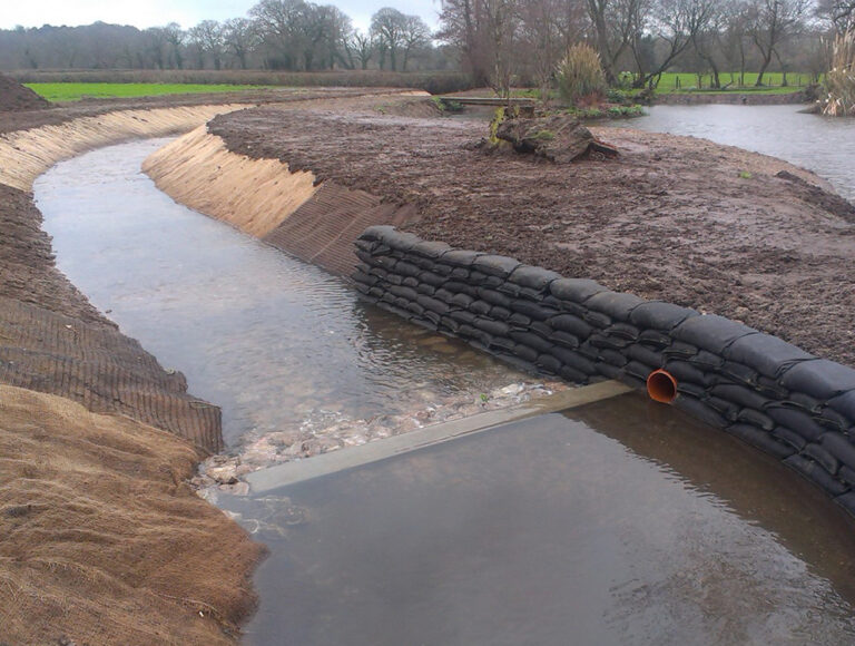 The final location required the construction of a flood alleviation channel within the land of a residential property. The property also had two ponds which required a sweetening flow from the river to be maintained. New weir and dam structures were installed and finished with a concrete apron, silt traps and walls constructed of Flex MSE bags, which were subsequently planted up with native species.