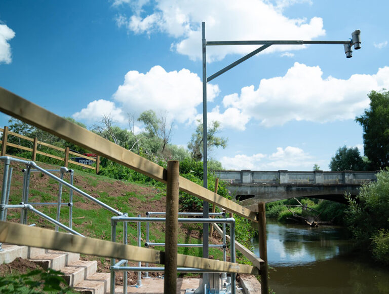 The pole, arm and made-to-measure radar brackets were installed alongside the embankment retaining wall downstream of the existing control cabinet and designed so that the pole could be lowered easily into a safe working area for maintenance.