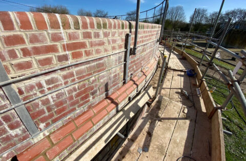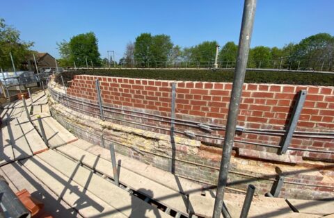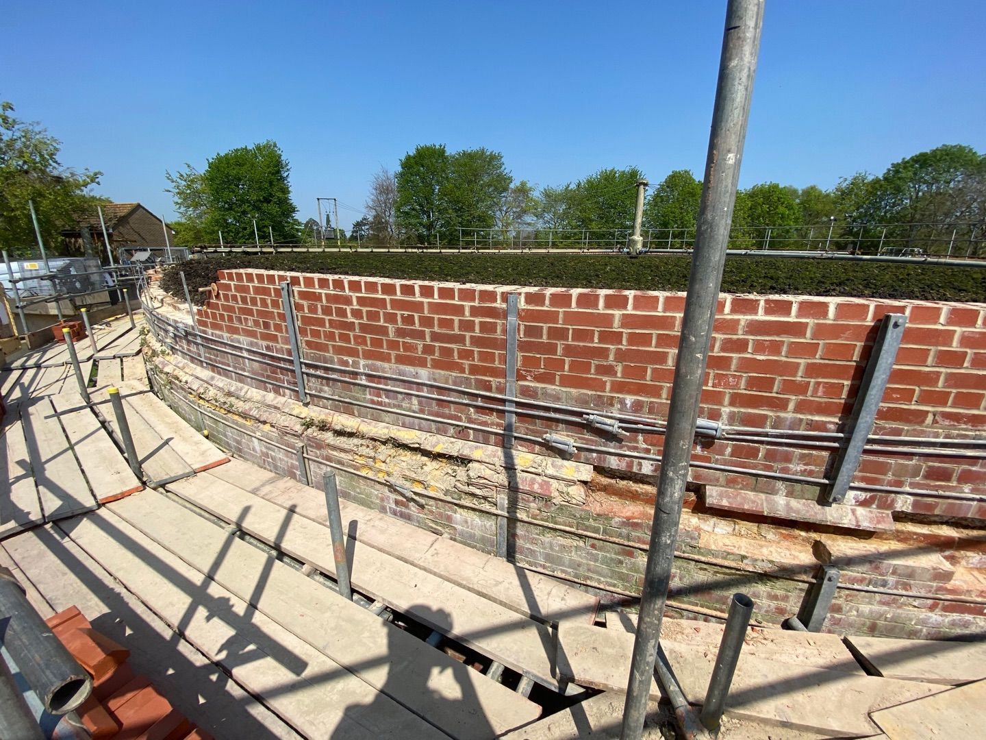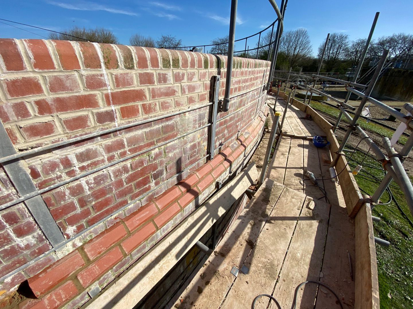 Masonry repairs were completed in 12-metre sections. Coping stones were removed, and the brickwork below was carefully demolished and rebuilt, reusing original bricks wherever possible. Chamfers were relaid in specific locations, and coping stones reinstated once the wall rebuilds were complete.