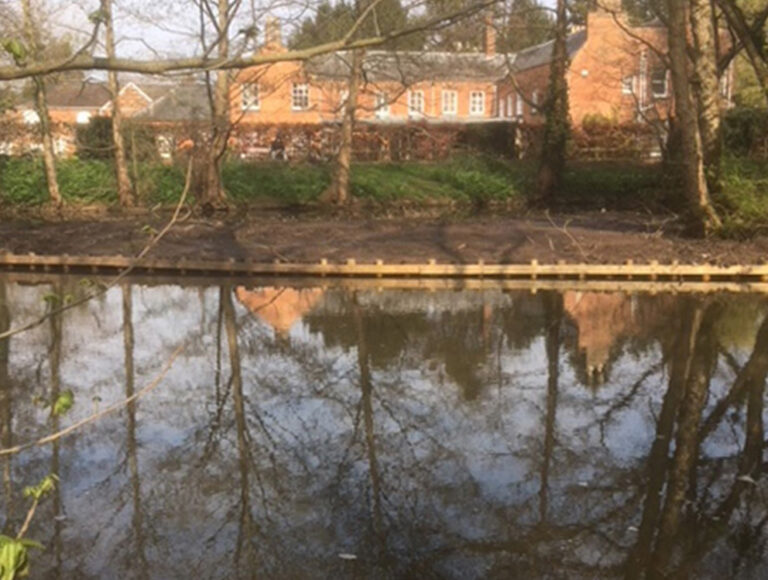 Working closely with the client and the Environment Agency, a method of works was agreed and the relevant permit was applied for, to allow the works to be completed. Temporary pollution control measures were then installed downstream of the lake to avoid any silt or oils entering the watercourse.