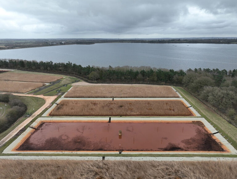Using specialist excavator equipment and specially-trained operatives, the senesced reeds were cut, taking care to preserve the rhizome and around 250mm of growing medium. Around 4700 tonnes of sludge material were removed from the reedbed and left to dry out for three months in a designated storage area before being transported offsite for Waste Acceptance Criteria (WAC) testing and sustainable repurposing.