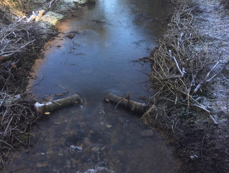 The team worked to clear felled trees and remove brash, using the arisings to shape an ephemeral pond – a pond that holds back floodwater and drains slowly – located on the channel and built a suitable habitat for newts which were identified during the channel clearance.