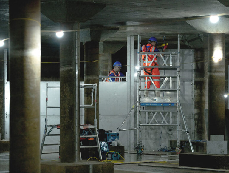 Twenty concrete block baffle walls were demolished block by block, lowered carefully into skip sacks to avoid damaging the new overbanding and lifted out through the hatch using a gantry and mechanical winch. After demolition, Flagon curtains were installed along the 18 columns. The two sections nearest the inlet pipe were backed with the newly fabricated stainless-steel curtains to buffer the pressure from fast-flowing water.