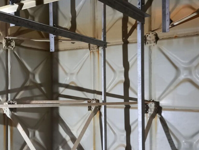 Internally, new grade-316 stainless steel angle supports were installed to the underside of the tank roof to increase its strength and rigidity. The metalwork was designed to be installed without welding or drilling to preserve recently applied interior coatings and avoid internal hot works.