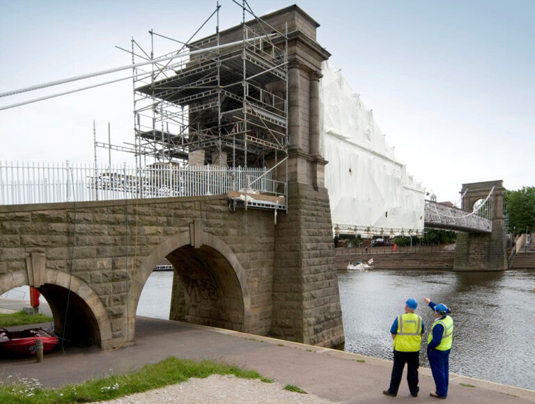 The refurbishment programme includes the reinforcement of main bridge beams, replacement of defective structural supports and fixings, and stripping back and replacing protective coatings to the steelwork. The timber deck will also be replaced and anti-pigeon measures are being installed. The masonry towers and approach structures are being re-pointed and numerous minor works are also being undertaken.
