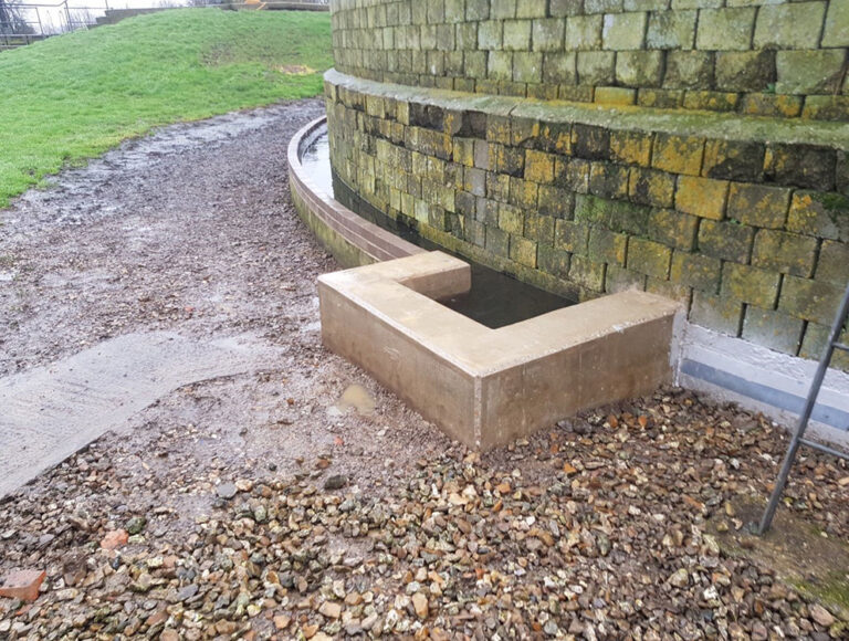 To complete the works shuttering was installed around the existing outlet pipe, followed by a concrete pour to form the new outlet chamber.